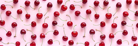 Banner with pattern of red sweet cherry berries on pink background. Flat lay top view.
