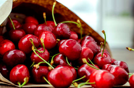 Fresh selected cherries in a paper bag lie on a wooden table. Large, ripe sweet cherry with green cuttings. Light vegetarian snack, healthy food. Eco-friendly packaging of berries. Close-up.