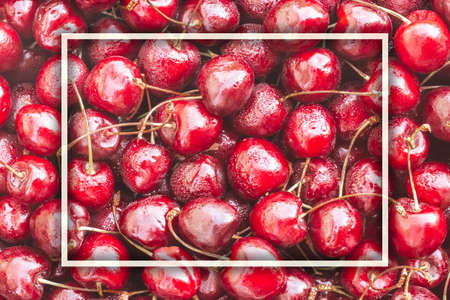 Background image of lying red ripe sweet cherries with white rectangular frame. Top view. Flat lay. Copy space