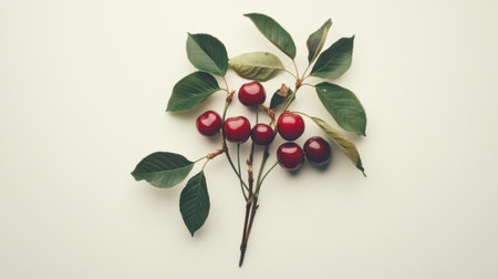 Cluster of ripe cherries with leaves, arranged elegantly on a white surface for a fresh and vibrant look