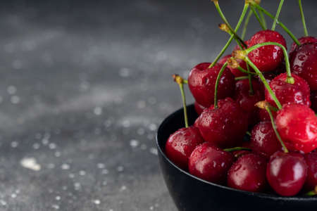 Selective focus, ripe cherries with water drops, in a black bowl, on a dark background, copyspace