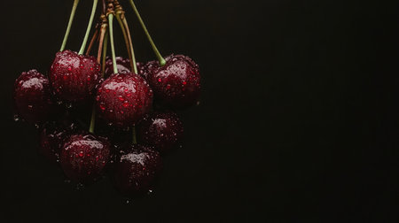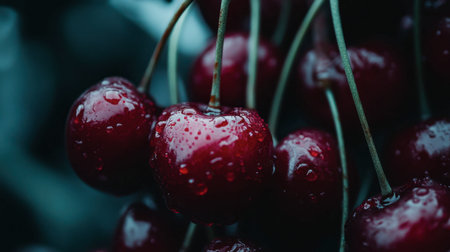 A visually striking arrangement of fresh cherries with glistening stems, set against a dark background, highlighting their rich color and texture. Perfect for food photography.