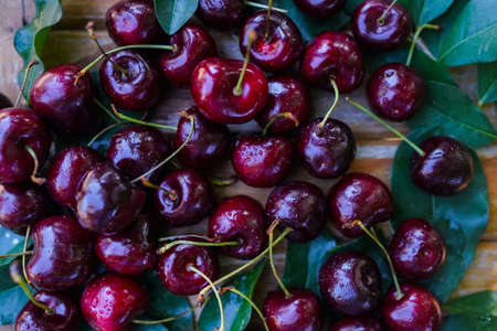 Close up of pile of ripe cherries with stalks and leaves. Large collection of fresh red cherries. Ripe cherries background