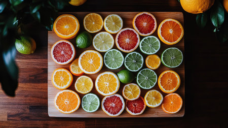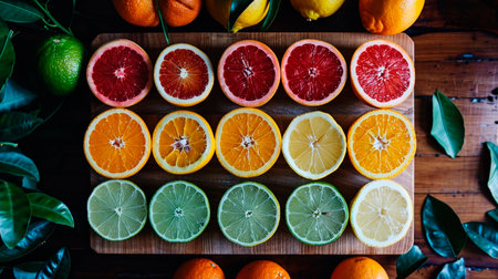Bright and colorful sliced citrus fruits arranged in a pattern, showcasing their juicy, vibrant colors.