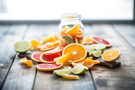 A colorful display of sliced citrus fruits such as orange, peach, and amber produce a vibrant array on the table. These ingredients can be used to create a delicious fruit dish in various cuisines