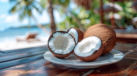 A fresh coconut halves on a bamboo mat with green palm leaves, capturing the essence of tropical lifestyle with natural light illuminating the scene.
