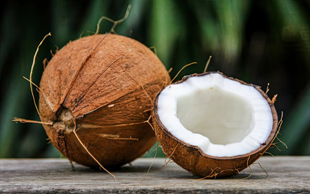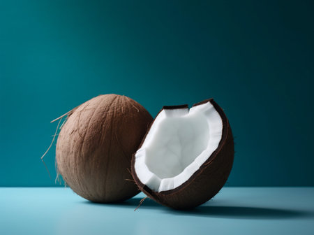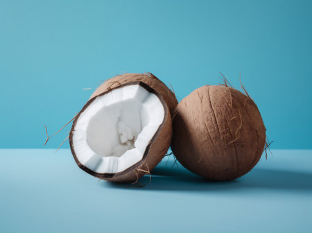 AI Generated. Two coconuts sit side by side on a white surface One is split in half