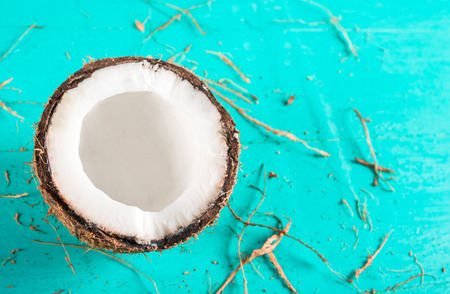 Broken raw coconut on blue backgound. Top view, flat lay with copy space