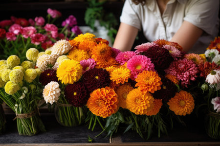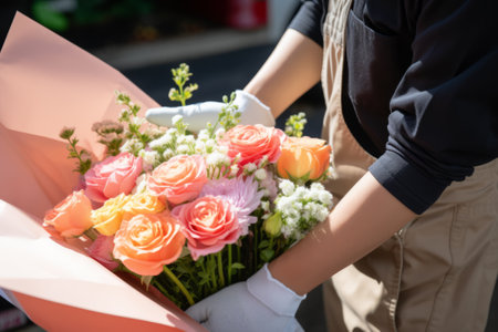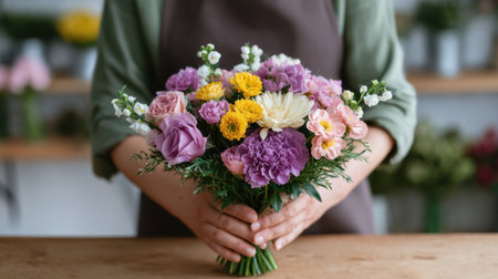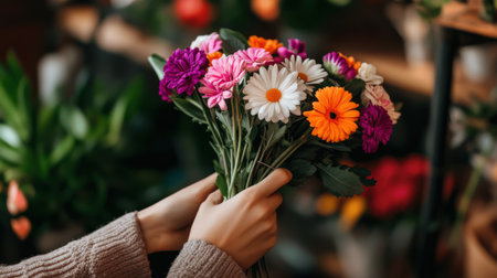 A skilled florist arranging a colorful bouquet in a flower shop, showcasing their expertise in floral design