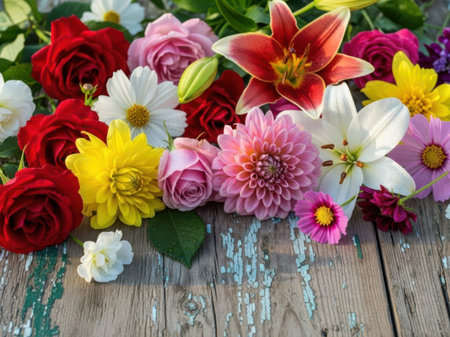 Vibrant and colorful mixed flower bouquet in a stunning still life composition for decoration