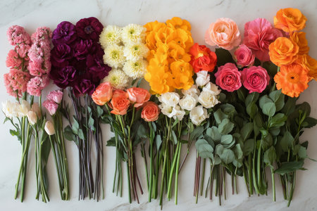 A stunning display of diverse flowers in a myriad of colors ranging from reds and pinks to yellows and purples, laid out carefully on a white surface. This floral composition exudes beauty.