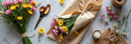 Floral arrangement with pink and yellow flowers, craft paper, scissors, and twine. That the image is generated using AI.