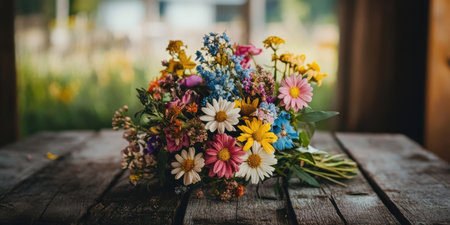 Fresh handpicked wildflowers featuring pink, white, and yellow daisies bundled on weathered wood, evoking spring charm for wedding invites, Mother's Day cards, or lifestyle ads. Blurred green garden background adds natural depth, ideal for floral blogs, e-commerce banners, and romantic marketing.