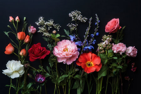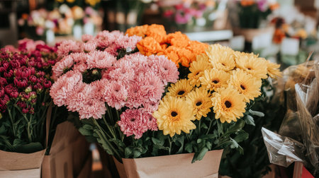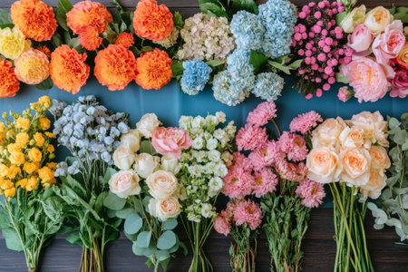 A vibrant assortment of fresh seasonal flowers perfect for spring and summer displays. Each bloom showcases striking colors and intricate textures. Ideal for floral arrangements or market scenes.