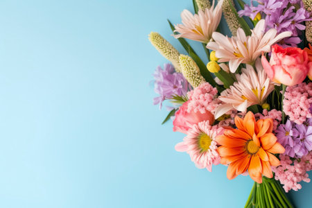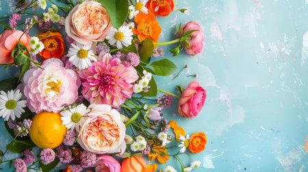 A vibrant arrangement of colorful spring flowers on a blue background. Perfect for seasonal themes, nature, and floral displays.
