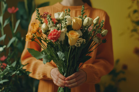 A woman is holding a bouquet of flowers in her hands. The flowers are a mix of yellow and orange, and they are arranged in a vase. The woman is wearing an orange sweater