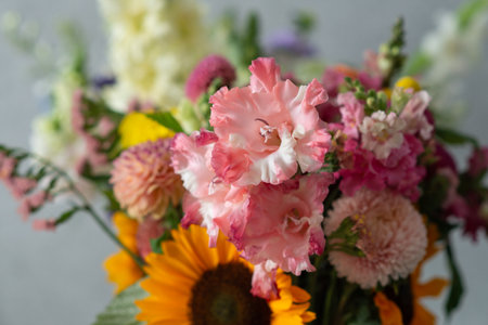 Vibrant bouquet of assorted flowers with vivid colors and delicate blooms displayed on a neutral background