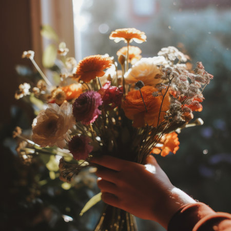 A person holding a bouquet of flowers in front of a window. Generative AI image.