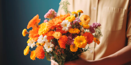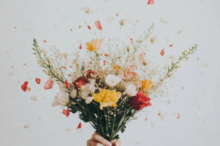 A beautiful bouquet of colorful flowers held in hand, surrounded by falling petals, symbolizing love and joy in a bright and cheerful atmosphere