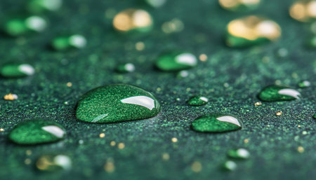 Close-Up Water Droplets Beading on a Green Metallic Surface, Showcasing Hydrophobic Properties