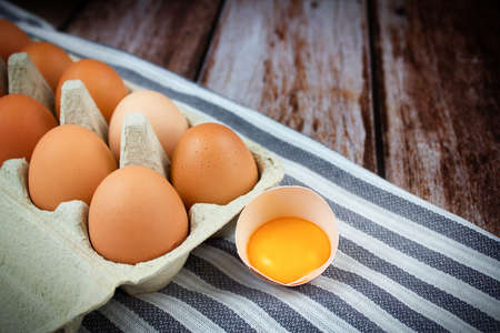 Eggs background. Eggs in a cardboard box on a wooden background. Yolk in an eggshell