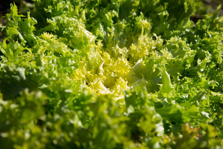 Close-up of fresh frisee lettuce, showing its vibrant green and yellow hues, creating a textured background at a farmers market