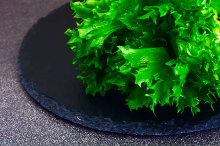 Fresh frisee salad in wooden bowl. Healthy food. Dark concrete background. Copy space. Top view