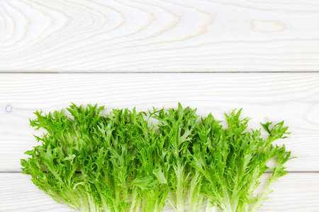 Bunch of raw organic green frisee salad on white wooden background. Close up. Top view. Copy space.