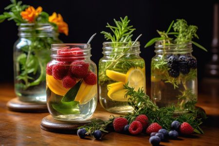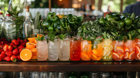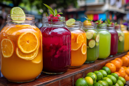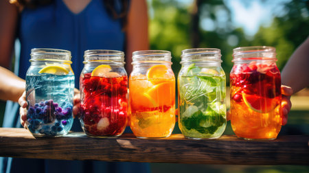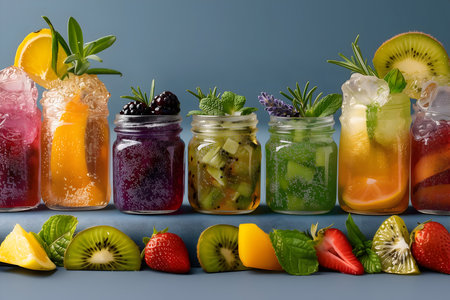 Vibrant fruit drinks in jars topped with fresh fruits, herbs, and ice. A refreshing display of natural, healthy beverages.