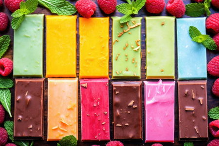 shot of vegan chocolate bars with multiple flavors like mint, orange, raspberry, created with generative ai