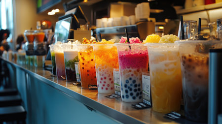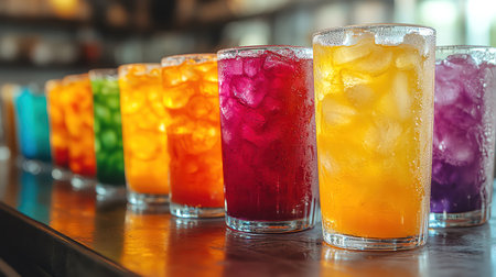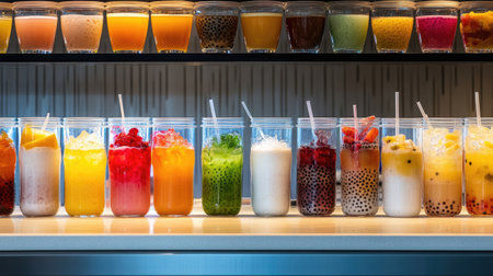 A vibrant display of assorted refreshing beverages in a cafe, showcasing a colorful variety of flavors and textures. Perfect for summer vibes!