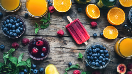 A vibrant display of fresh fruits and beverages on a rustic wooden table, featuring blueberries, raspberries, oranges, and a popsicle. Perfect for summer!
