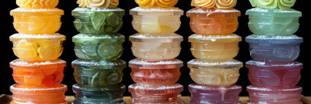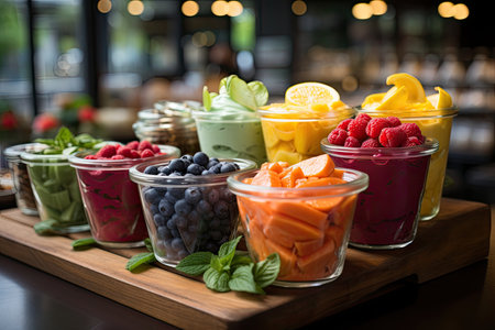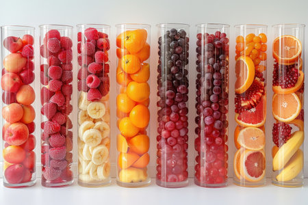 A row of fruit in glass containers Concept of freshness and health