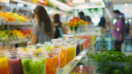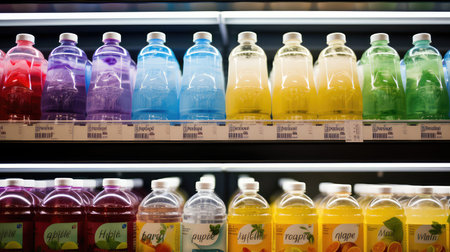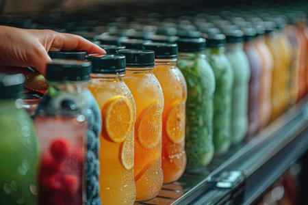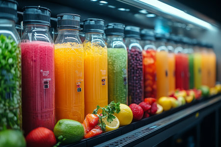 Colorful fruit juice bottles, healthy drinks, store display, fresh ingredients