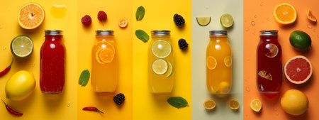 A vibrant lineup of glass bottles filled with different citrus juices, accompanied by fresh fruit slices, arranged on a bright yellow background, perfect for refreshing drink themes.