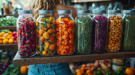 Healthy and vegan fruits and vegetables preserved in jars shine colorfully