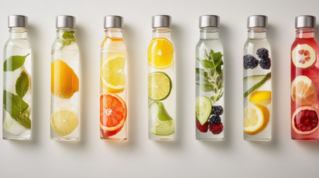 Variety of infused flavored water in bottles with fruits and berries.