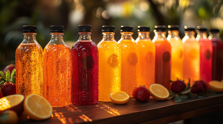 Colorful assortment of sparkling beverages displayed outdoors with fruits at sunset. Generative AI