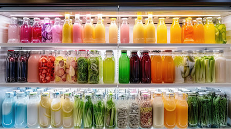 Colorful Juice Bottles in Fridge: healthy drinks, fresh produce, organized storage, beverage shelves, chilled drinks, diet choices, grocery items