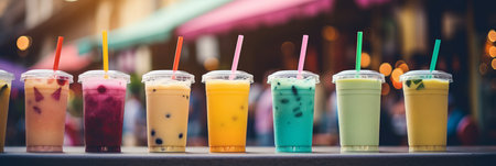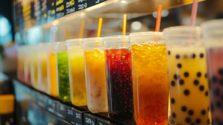 A vibrant display of refreshing beverages in clear cups, showcasing various flavors and colors. Perfect for summer gatherings or cafe menus.