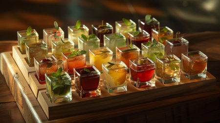 Variety of colorful mini cocktail shots on a wooden tray. Ideal for concepts related to beverages, entertainment, and hospitality design.