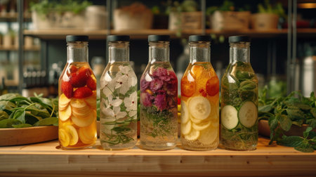 Fruit and vegetable infused water in glass bottles on a wooden shelf