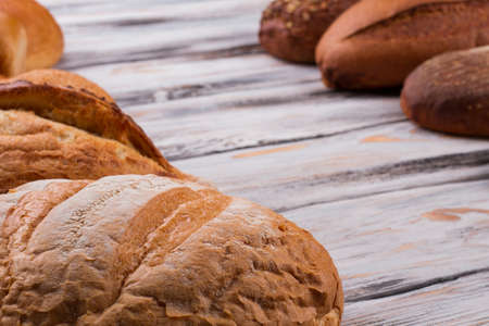 Various of baked bread on wooden table background