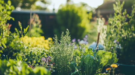 A close-up of fresh herbs like basil, cilantro, and parsley growing in a well-tended kitchen garden, with sunlight filtering through the leaves.