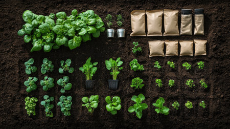 A visually appealing arrangement of fresh green vegetables and herb seedlings on rich dark soil. Ideal for gardening projects, farm-related content, or healthy living themes.