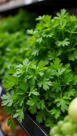 A lush display of parsley and celery captures the essence of freshness in a busy supermarket. Shoppers are drawn to the rich greenery, enhancing their culinary inspiration.