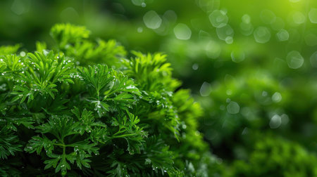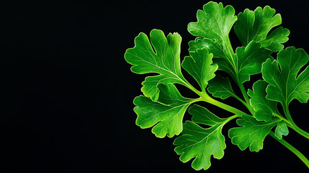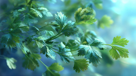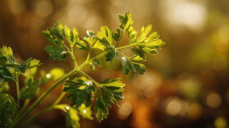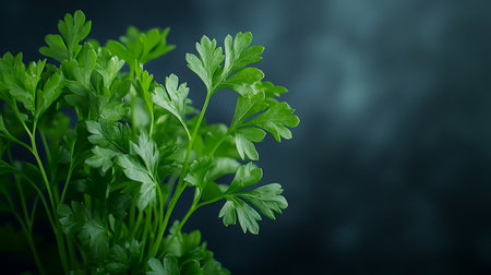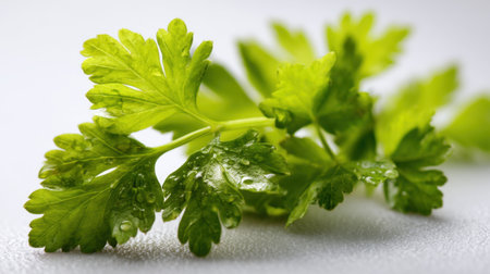 Fresh green parsley sprig with vibrant, detailed leaves captured in a close up shot. highlights natural texture and healthy appearance, symbolizing freshness and culinary use.