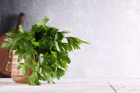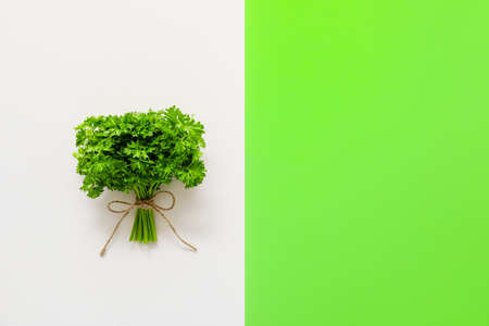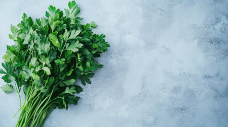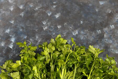 Fresh parsley bunch and copy space. Organic parsley on textured background, text space. Parsley for good health.