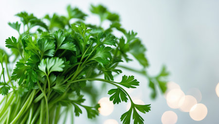 A vibrant bunch of fresh parsley with rich green leaves, perfect for culinary uses and garnishing. Ideal for food photography and healthy lifestyle themes.