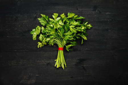 Fresh parsley herb on dark wooden background with copy space